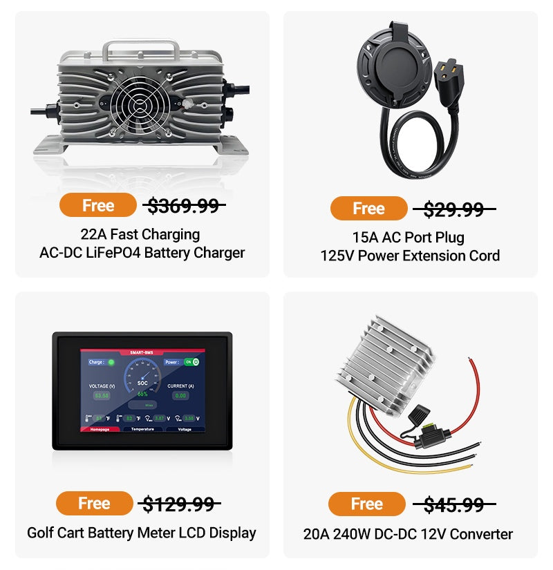 ·First CCS packed golf cart battery: Ultimate engergy efficiency and reliability with one CCS connects all. The less wires, the less chances of disconnection. ·First golf cart battery with circuit breaker: Ultimate safety with circuit breaker for final protection. On extreme condition when all BMS are not working, the circuit breaker would always keep your property safe.