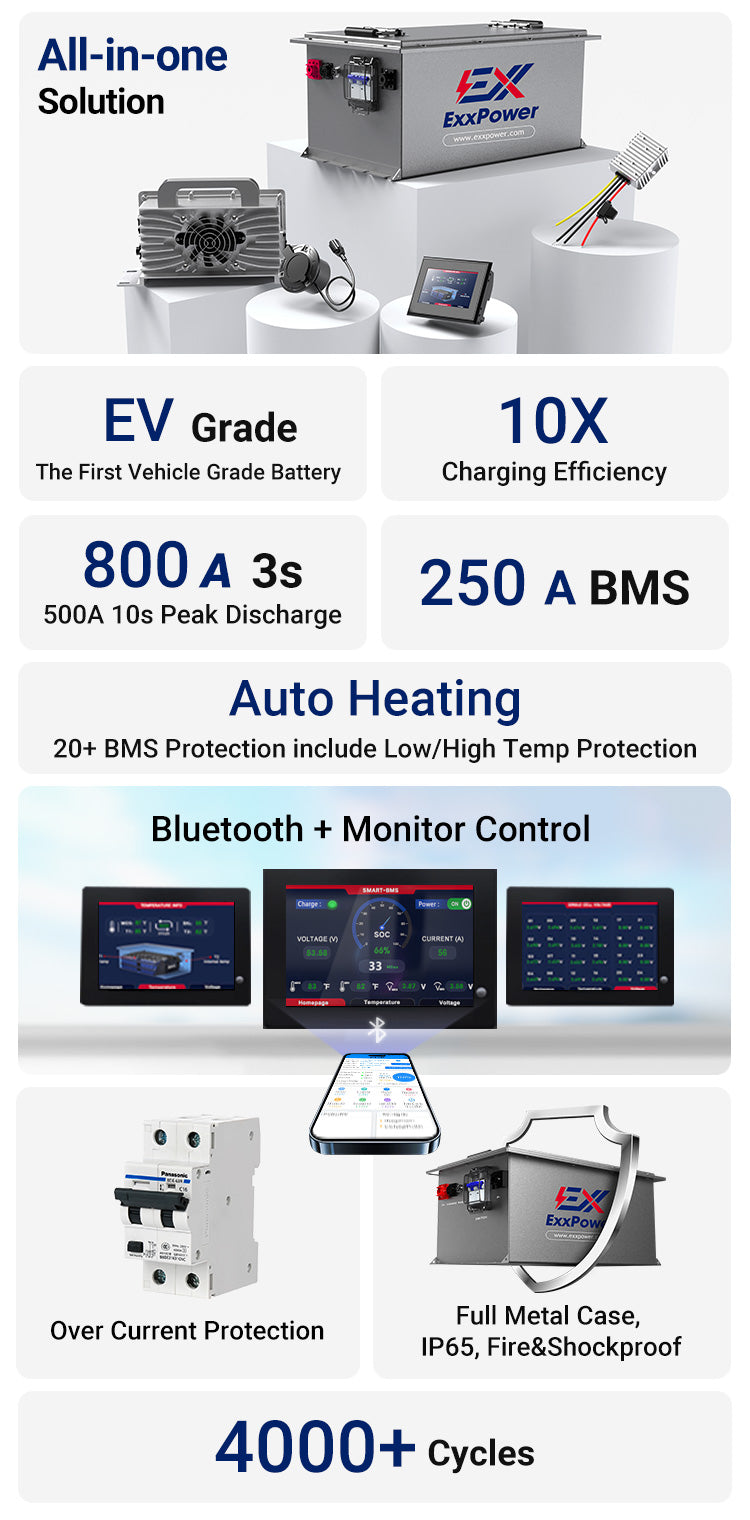Exxpower industry-leading 250A BMS provide 20+ protections safeguard against over-charging,over-discharging,over-current,overheating, overcooling and short circuits.Its high-temperature cut-off function guarantees a safe charge/discharging operation in harsh scenarios.
